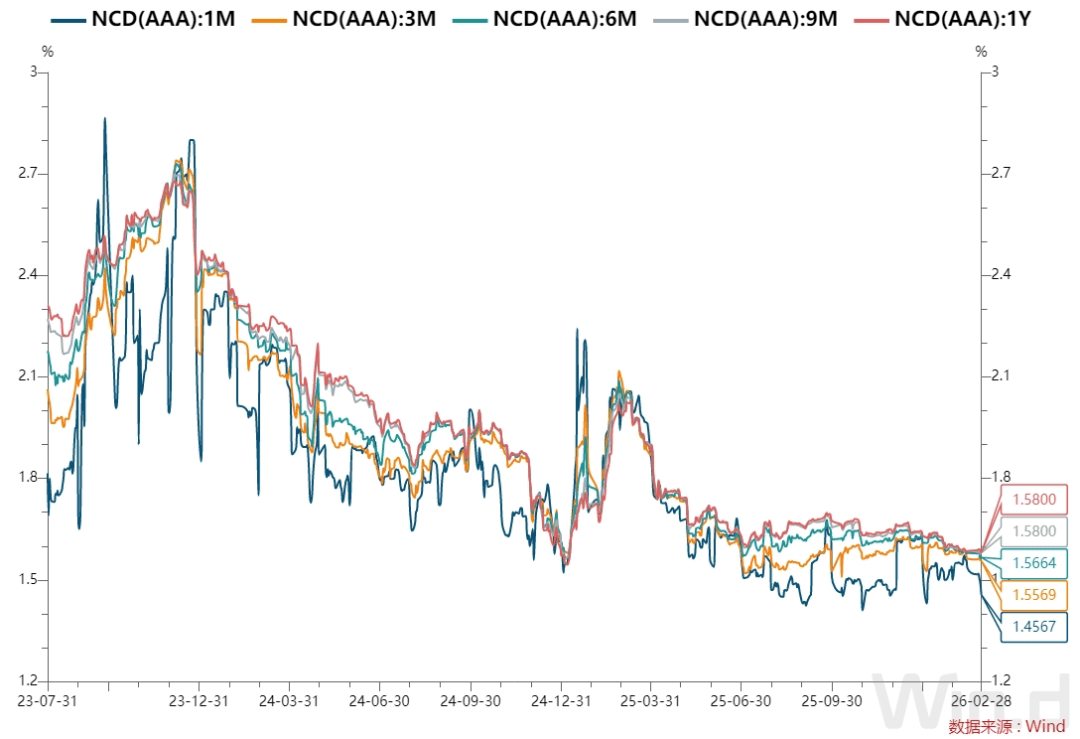 全国和主要股份制银行一年期同业存单最新成交在1.58%位置,较上日小幅下行。