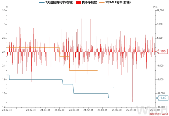 央行公告称,3月2日以固定利率、数量招标方式开展了190亿元7天期逆回购操作,操作利率1.40%,投标量190亿元,中标量190亿元。Wind数据显示,当日无逆回购到期,据此计算,单日净投放190亿元。