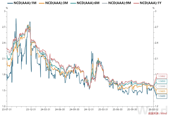 全国和主要股份制银行一年期同业存单最新成交在1.59%附近,较上日小幅下行。